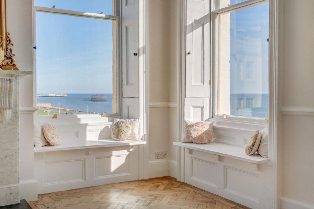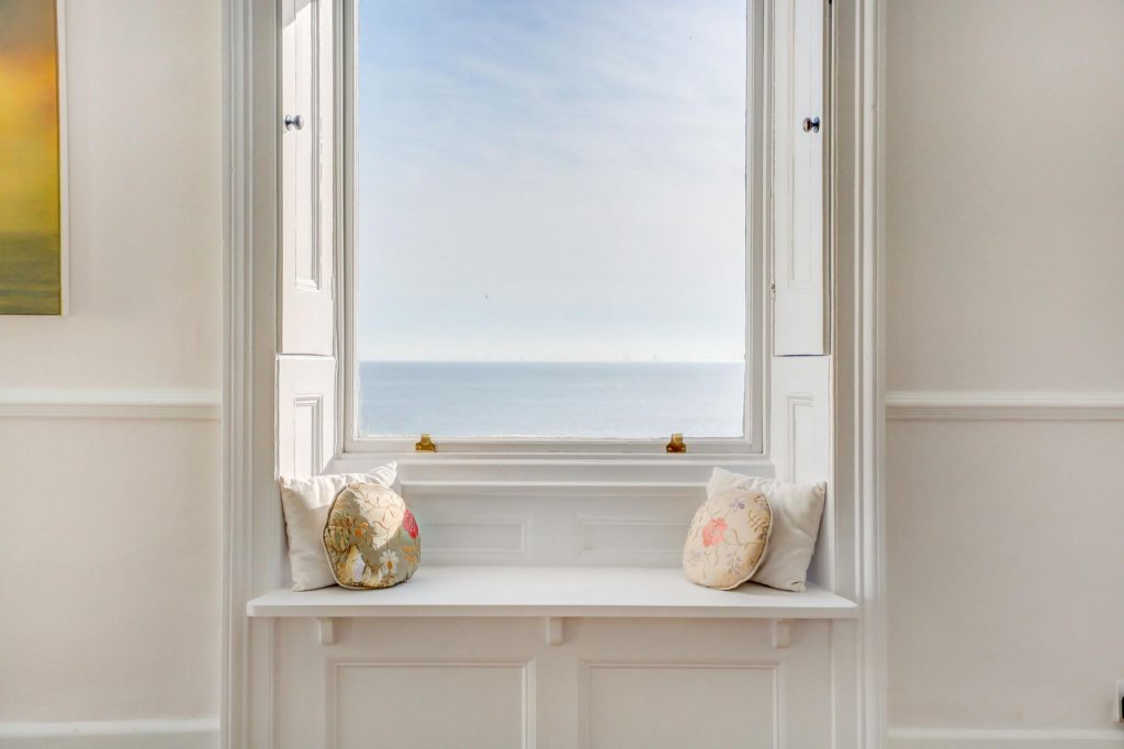 Upon entering the apartment, a spacious hallway links each of the principal rooms, with dark-stained wooden parquet flooring drawing the eye through to a stunning dual-aspect living and dining space. Regency charm abounds, from the acanthus-leaf cornicing to the tall sash windows that frame picturesque views directly out to sea, as well as eastwards along the Kingsway with the i360 visible in the distance. Built-in, wooden-framed banquette seating beneath the windows offers an idyllic spot to read, relax, or simply watch the tide roll in.