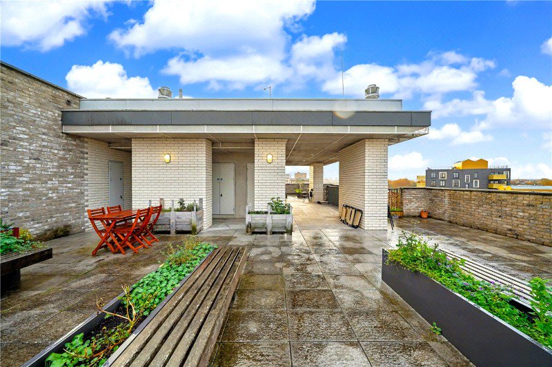 Residents benefit from a large communal roof terrace with impressive views across London.