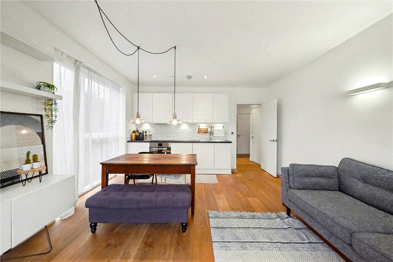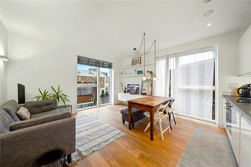 A bright open-plan kitchen and reception room forms the centrepiece of the apartment, featuring floor-to-ceiling windows, allowing for plenty of light. The property also includes a well-proportioned double bedroom and a sleek, modern bathroom.