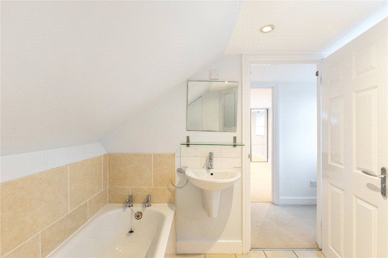 Stairs lead to the second-floor principal bedroom, which benefits from skylights, fitted storage and a further bathroom. The apartment retains attractive period touches, including sash windows and cast-iron fireplaces, combined with clean modern finishes and good natural light throughout.