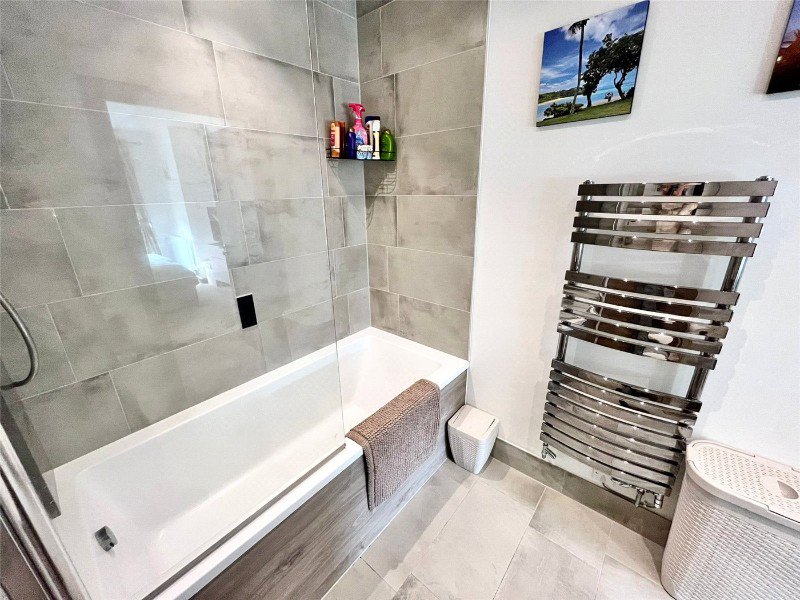 Joining the bathroom is modern and well-finished, with a full-sized bath, overhead shower, and contemporary tiling – clean lines, neutral tones and nothing overcomplicated. Just a well-designed, practical space that does exactly what you need it to.