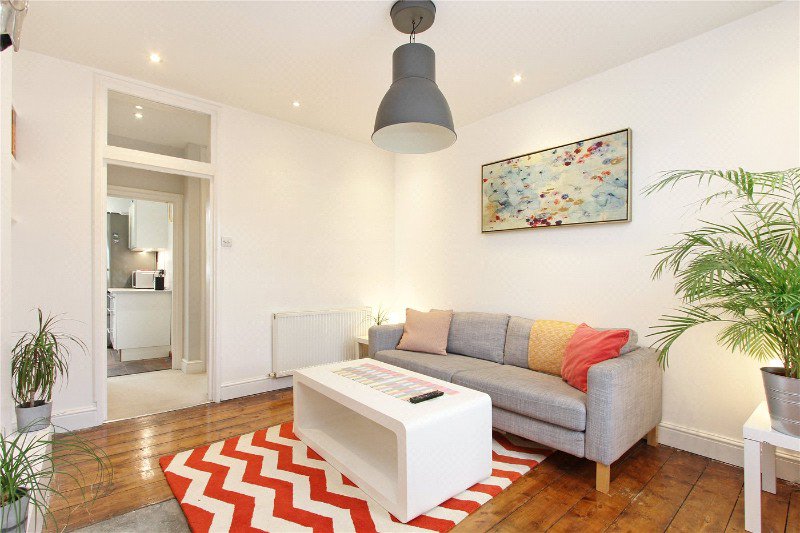 The living room offers a warm, inviting space, while both bedrooms are well proportioned with good natural light. The kitchen and bathroom are neatly finished, complementing the apartment’s period charm.