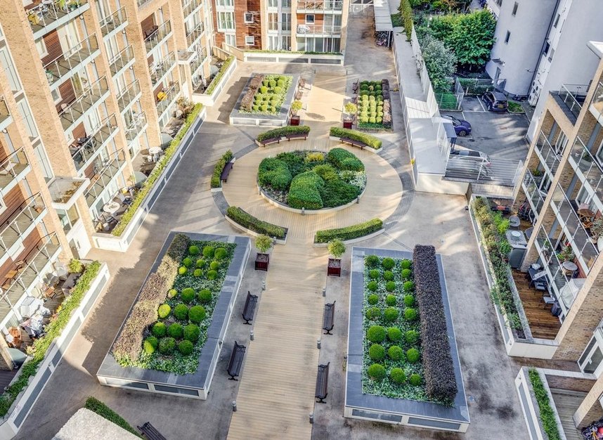 A beautifully upgraded one-bedroom apartment featuring a remodelled kitchen and bathroom, cooling system for year-round comfort, a walk-in storage cupboard and bespoke Hammonds cabinetry with integrated power points. The spacious wraparound terrace with new composite decking offers excellent privacy, and the flat sits in the quiet V8 block on the raised ground floor with no neighbours beneath. Residents also benefit from a 24/7 concierge, communal roof gardens, landscaped courtyard and a secure, air-conditioned residents' gym.