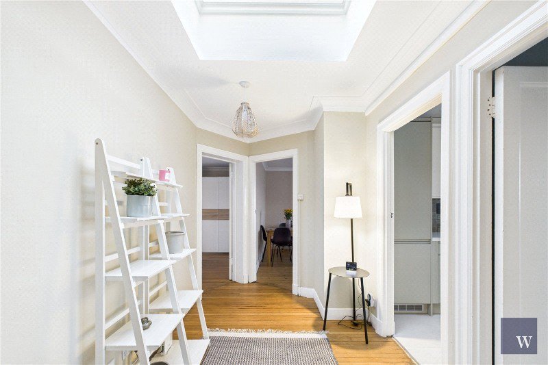 A wide entrance hallway welcomes you in, illuminated by a striking skylight that instantly creates a sense of light and space. The layout flows naturally into a bright living room with large windows, offering an elegant space for relaxing or entertaining. The separate kitchen is smartly designed with contemporary cabinetry and good storage, while the bathroom features chic tiling and clean, modern fittings.