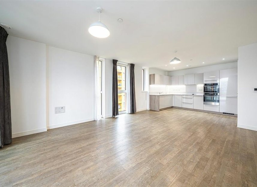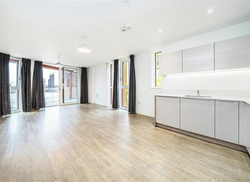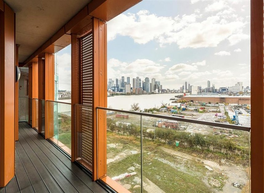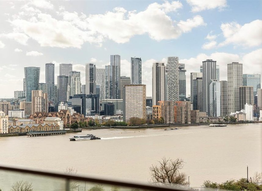 This beautifully presented seventh-floor apartment offers three bedrooms, two bathrooms and 988 sq ft of modern, high-spec living within the sought-after Enderby Wharf development. The spacious open-plan living area features floor-to-ceiling windows, leading to an almost 100 sq ft private balcony with far-reaching views of Canary Wharf and the Thames.