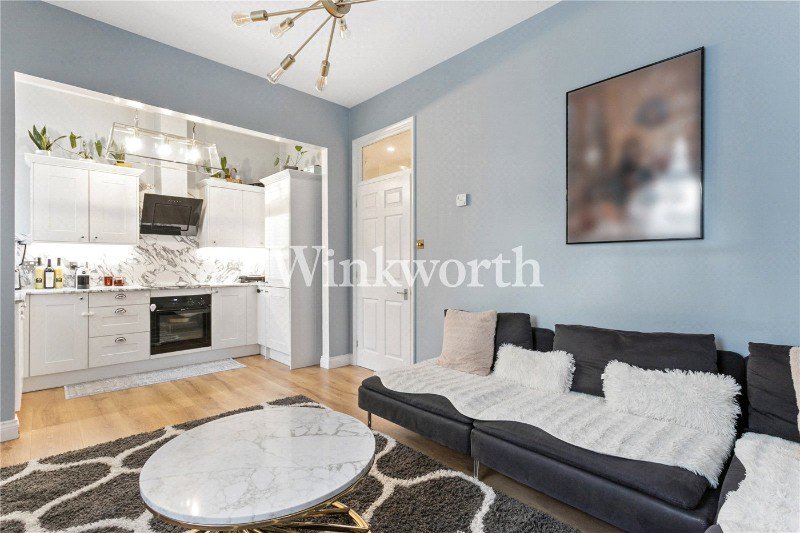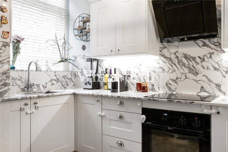 The property has been significantly updated by the current owner creating a light and stylish interior with modern finishing touches. You will find a spacious open plan kitchen and living room with two sash windows drawing in natural light. The kitchen features modern wall and base units with a marble worktop and splashback, and integrated appliances. The living room benefits from a built-in entertainment unit with an electric real flame-effect fire. There are two well-proportioned bedrooms with built in wardrobes and a luxury shower room. Additional benefits include an intercom entry phone system, gas central heating, and residents parking.