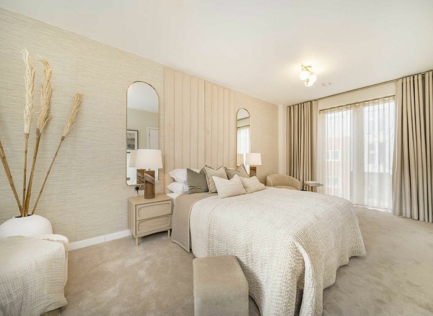 The spacious open plan living area features a sleek modern kitchen with quality integrated appliances and is filled with natural light, with doors that open onto a private balcony. Two well proportioned bedrooms and a sleek family bathroom complete this elegant home. *Images of the show home*