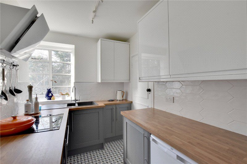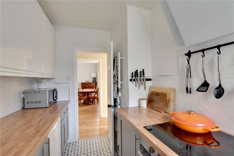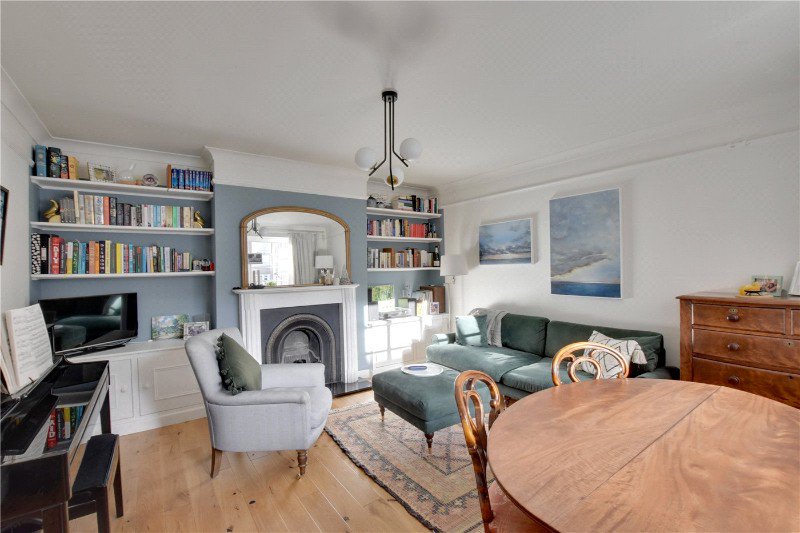 The accommodation features a generous reception room with bespoke fitted storage framing a decorative fireplace, creating a warm and inviting focal point. There are two double bedrooms, each well proportioned, along with a fabulous modern kitchen, newly fitted in 2022, and a stylish shower room updated in 2019. Quality touches include engineered oak flooring throughout.