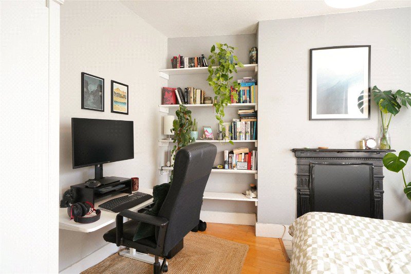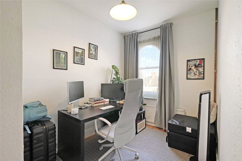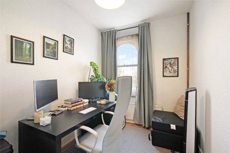 The flat, which has its entrance on the first floor off the communal hallway, comprises a reception room, a separate kitchen, a bathroom and two bedrooms (one used as a study/office).