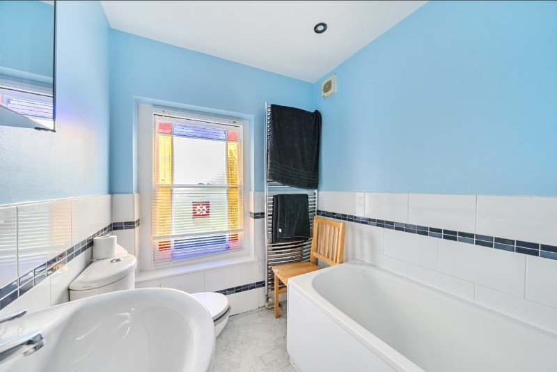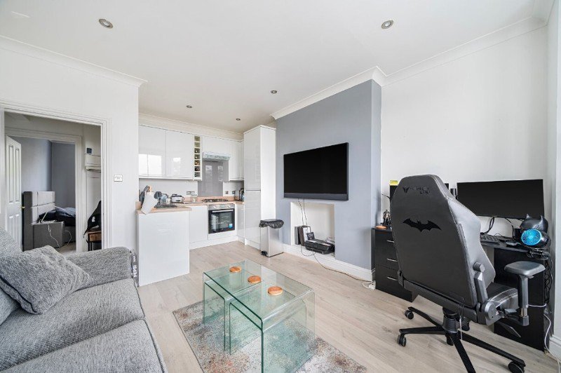 The open-plan kitchen/reception room benefits from high ceilings and a large sash windows, filling the space with natural light and creating an inviting setting for both relaxing and entertaining.