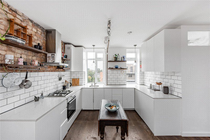 The spacious open-plan kitchen/reception features exposed brickwork, engineered wood flooring and a charming working gas fireplace, creating a warm and stylish central living space. Both bedrooms are generous doubles, complemented by a bright and contemporary bathroom suite.