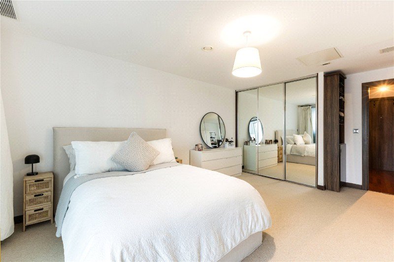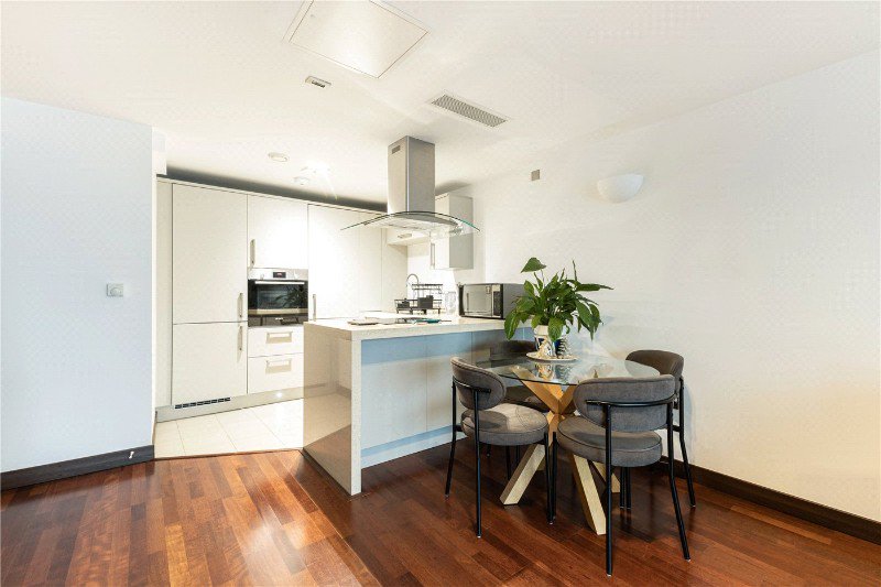 Designed to maximise light and the river outlook, the apartment features a generous open-plan integrated kitchen with breakfast bar and reception room with wood flooring. An ideal space for everyday living and entertaining. Ceiling to floor windows and a private winter garden (enclosed balcony) overlook the Thames, providing an excellent spot to enjoy the outlook whatever the weather.