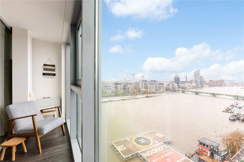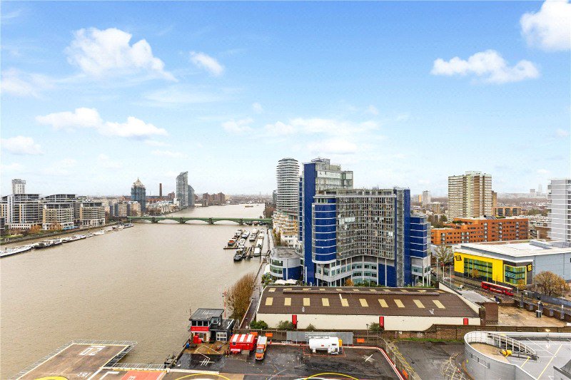 A bright twelfth-floor one-bedroom apartment of approx 59.6 sq m / 641 sq ft with a generous open-plan kitchen/reception, private winter garden and sweeping Thames views. Lift-served building with 24-hour concierge, private underground parking for two cars and a communal garden with a pond.