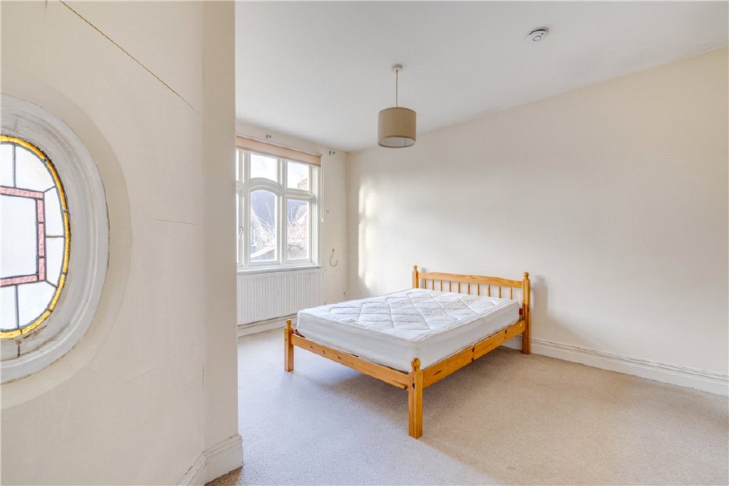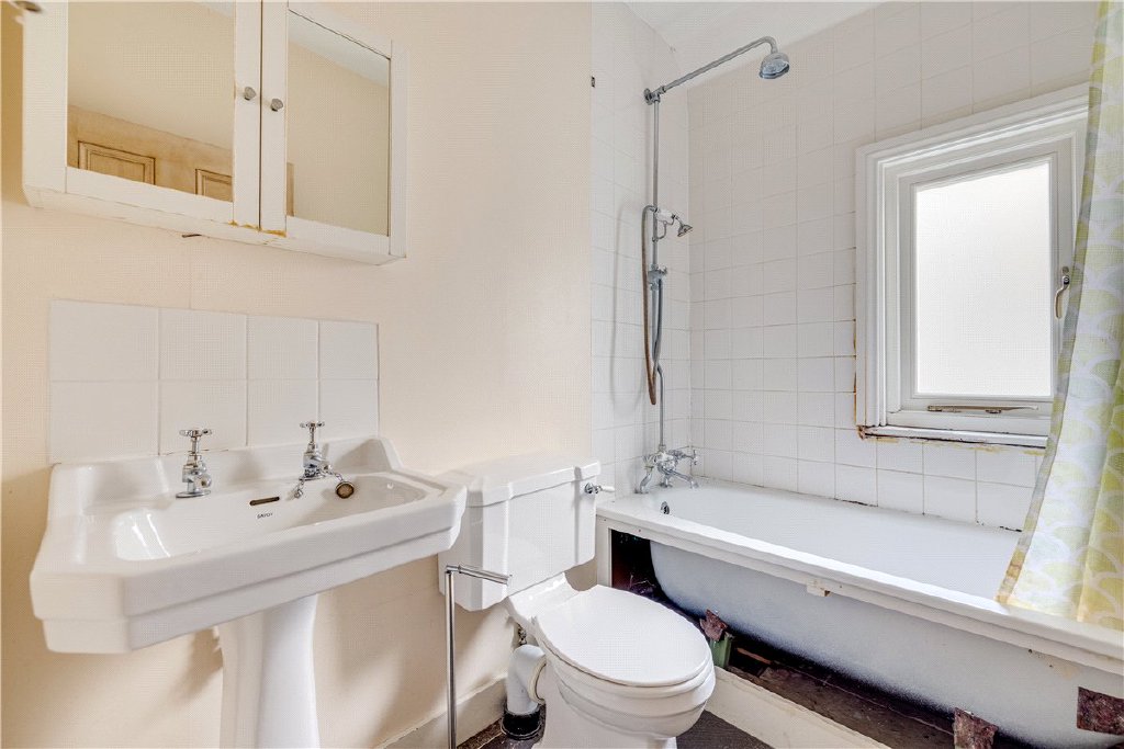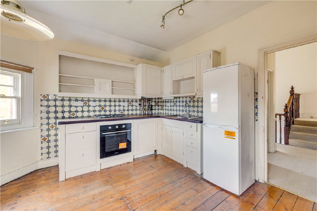 Arranged over the top floor of this imposing Victorian building, moments from Wandsworth Common, is this vastly proportioned two-bedroom flat measuring over 1,000 square feet. The property is presented in good condition with scope to update, with newly fitted double glazed windows throughout. The flat is laid out laterally, with an eat-in kitchen/breakfast room comprising original wooden flooring, Victorian fireplace, and integrated appliances, whilst a spacious separate reception room also boasts an original, red-tiled fireplace.