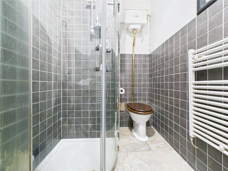 The bathroom has been smartly finished with stylish grey tiling and a modern shower enclosure. It also features an attractive high level cistern WC, adding a touch of classic period character in keeping with the building’s heritage.