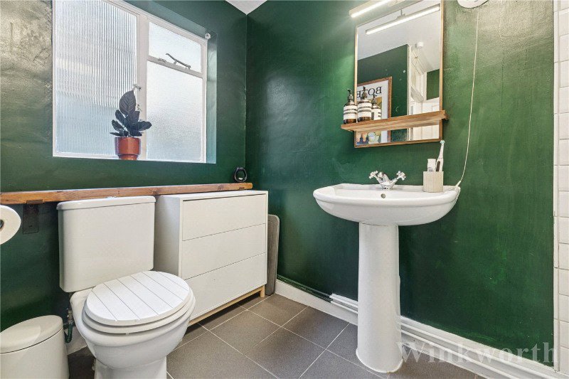 The double bedroom is well proportioned and overlooks the rear garden, offering a peaceful retreat. The bathroom is finished with a classic white suite, including a pedestal wash basin, bath and shower, complemented by natural light.