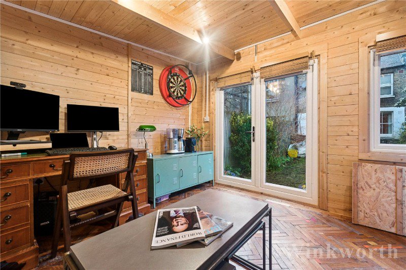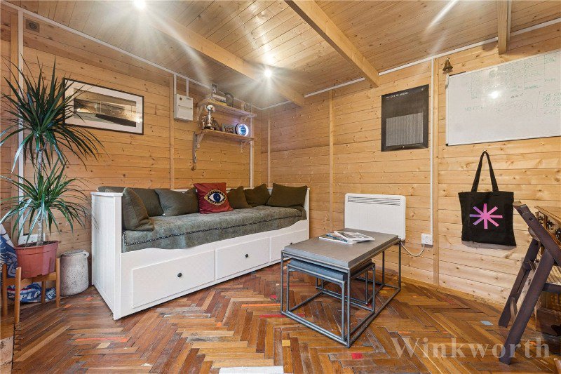 The private rear garden provides a welcome outdoor space and further benefits from a timber chalet, offering versatile storage or potential for alternative use.