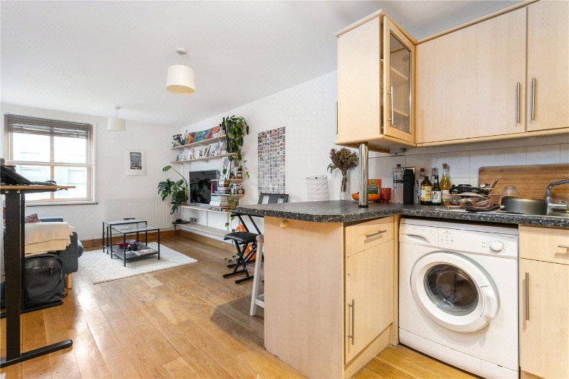 The property features a bright open-plan kitchen and living area, making excellent use of the space and providing a comfortable setting for both everyday living and entertaining. The flat retains the charm typical of a period building while benefiting from a practical, modern layout. The bedroom is well-proportioned, and the accommodation is completed by a neatly arranged bathroom.