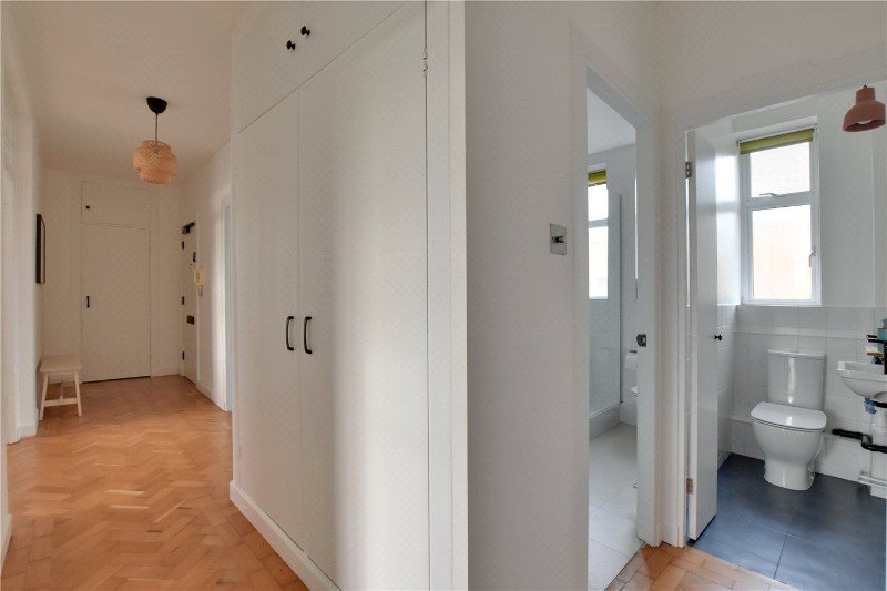 A lift serves the building and the home sits behind mature communal gardens with residents’ parking, giving a quiet, leafy outlook