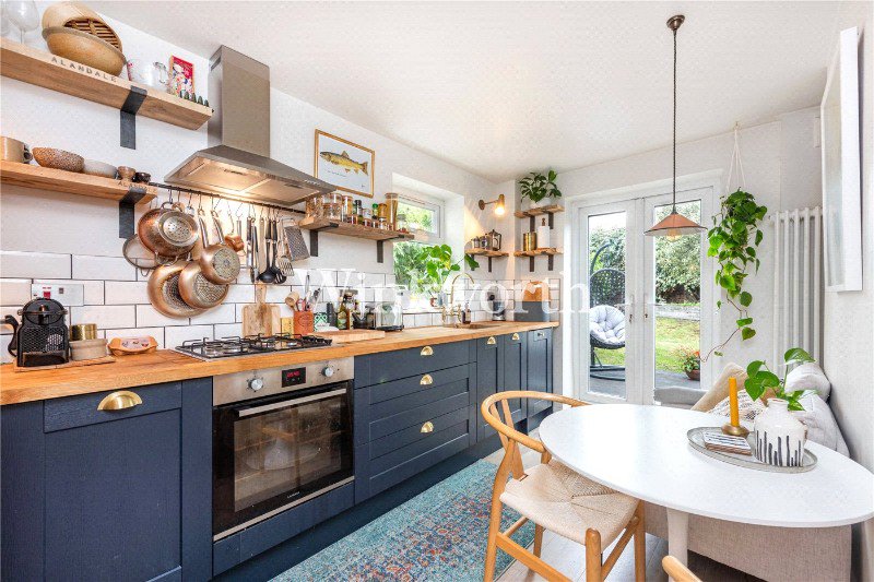 A short flight of steps leads down to the newly refurbished kitchen diner. Designed with a subtle country style feel, it opens directly onto a private garden extending to approximately thirty six feet. With its established planting and peaceful atmosphere, the garden provides a rare oasis within this popular urban neighbourhood.