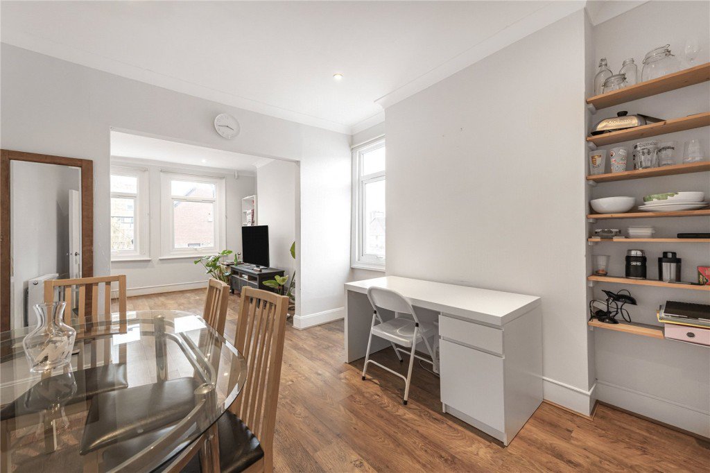 The spacious, light-filled reception and dining area is enhanced by large windows, flooding the room with natural light. High ceilings and original period features further elevate the space, while the neutral décor provides a versatile backdrop for personal styling. This open-plan layout also offers an ideal spot for a home office.