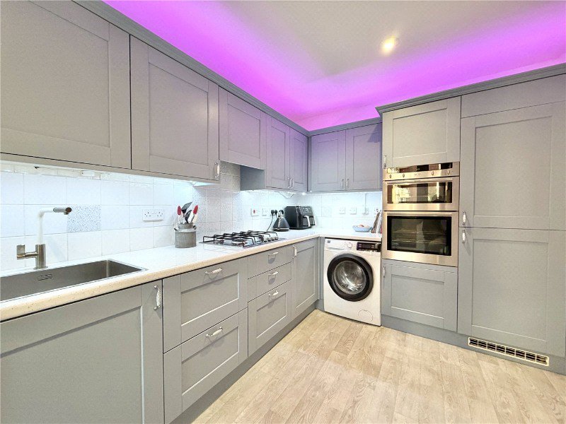 The lounge and dining area are incredibly bright, enjoying a westerly aspect with lots of windows and a sliding patio door which leads out on to the sunny balcony with stunning sea views. The kitchen is contemporary and comprises of a range of base and eye level work units with space and plumbing for domestic appliances