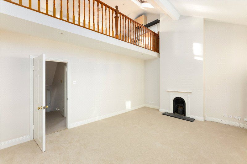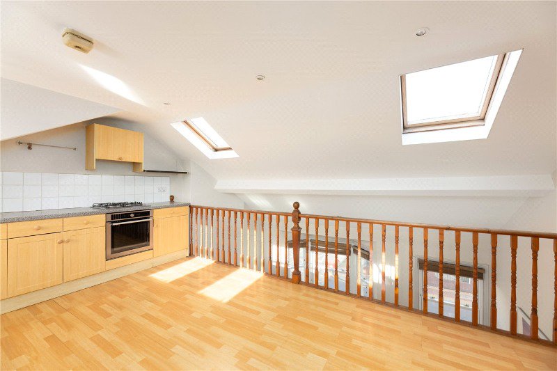 A bright reception room serves as the heart of the home, with generous natural light and an open, inviting atmosphere. Just above, a stylish mezzanine-level kitchen overlooks the reception area, creating a unique layout that adds character and maximizes space.