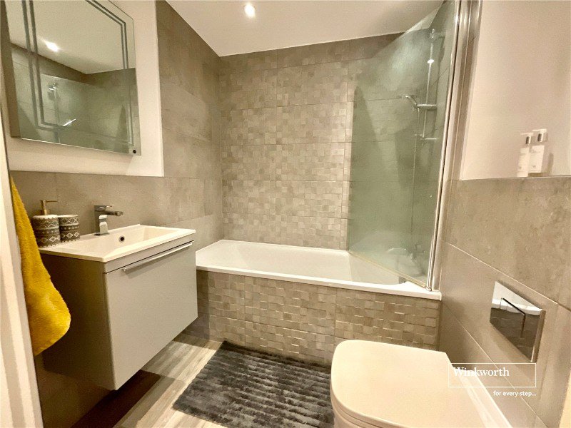 The bathroom is fitted with a modern suite, shower over the bath, sink with vanity unit and w/c