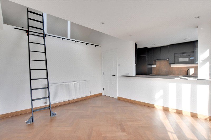 There are two comfortable double bedrooms (13'1 x 12'9 and 15'9 x 8'2) and a smart new bathroom with feature tiling, discreet utility provision for a washing machine and space for a tumble dryer, keeping everyday life beautifully out of sight. A library ladder in the living room leads to a useful mezzanine storage loft, adding character as well as practicality. Rewired and replumbed, the apartment measures approximately 698 sq ft / 64.85 sq m (including a small restricted-height area) and carries a clean, contemporary feel throughout, light, considered and ready to move straight into.