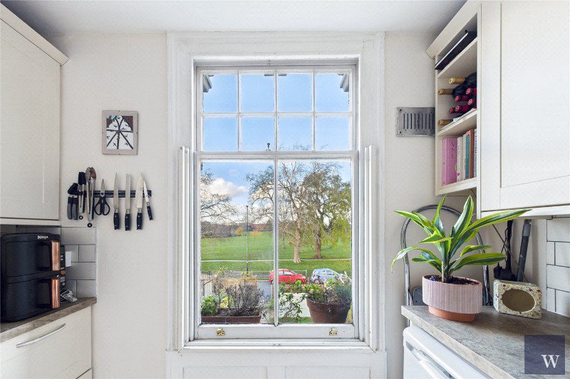The accommodation begins with a welcoming hallway leading into a bright and characterful reception room. A generous bay window draws in natural light while framing uninterrupted views across the Common, and an original fireplace provides a handsome focal point, anchoring the room with period charm. To the rear, the kitchen is well arranged with ample storage and worktop space, offering a practical yet comfortable setting for everyday living.