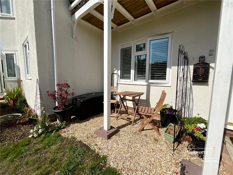 Outside the property has an area of patio directly from the living room and a seating area outside the bedroom window.