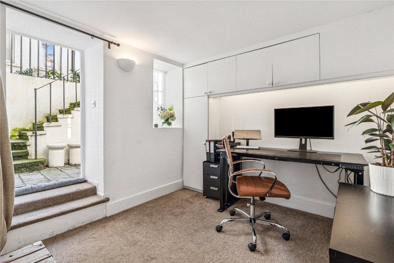 Measuring 800 sq.ft., this refined apartment offers a private, discreet entrance through private gardens. The entry hall, complete with a functional utility area, opens into an open-plan reception room characterized by warm wooden floors and a striking bay window. At the heart of the home is a fully refurbished kitchen with integrated appliances. The principal suite features bespoke fitted wardrobes and a contemporary new shower room. To the rear, a second bedroom currently utilized as a study provides direct access to a private courtyard, which includes valuable vault storage and convenient independent access to street level.