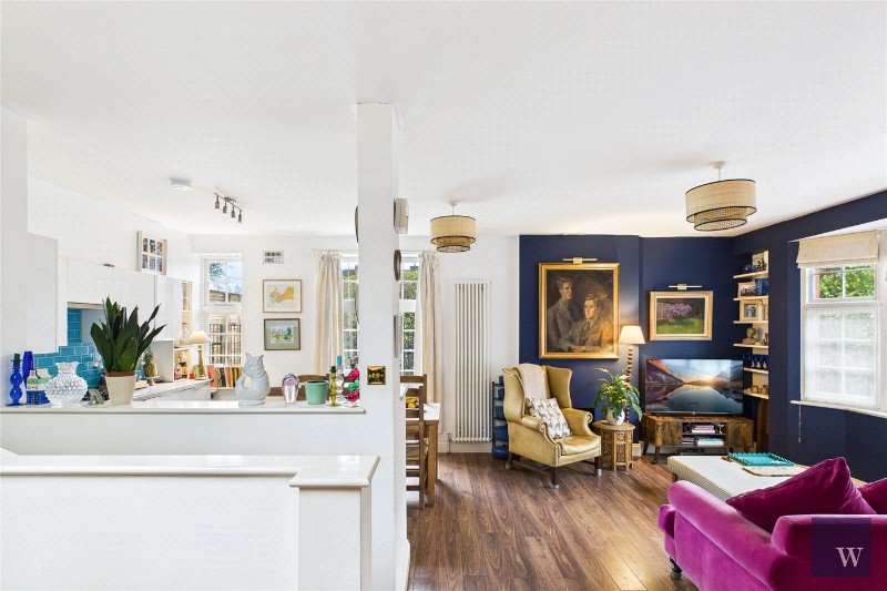 The home opens into a welcoming entrance hall, with the front garden at the entrance demised to the flat, providing a lovely first impression and a useful outdoor space for plants, bikes, or simply a quiet spot to sit. Leading through to a bright and stylish open-plan kitchen and living area. This is an impressive entertaining space, beautifully presented and finished with a contemporary kitchen, generous worktop space, and plenty of room for a dining table and comfortable seating. Double doors open onto the first terrace, creating an easy indoor-outdoor flow and a perfect spot for morning coffee or summer dining.