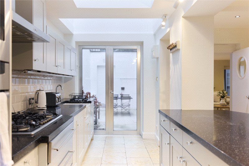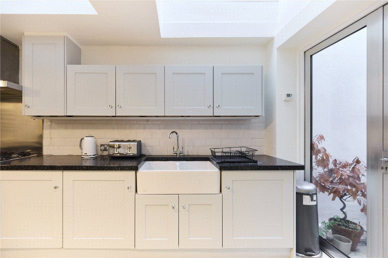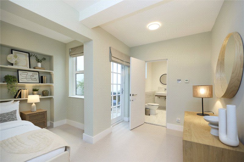 The apartment features three generous en suite bedrooms, a separate guest WC, and a spacious reception room ideal for both entertaining and everyday living, with large windows drawing in natural light and garden views. A substantial kitchen-dining room sits at the heart of the home, fully fitted with modern appliances, ample storage, and refined finishes.