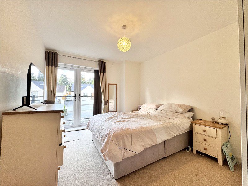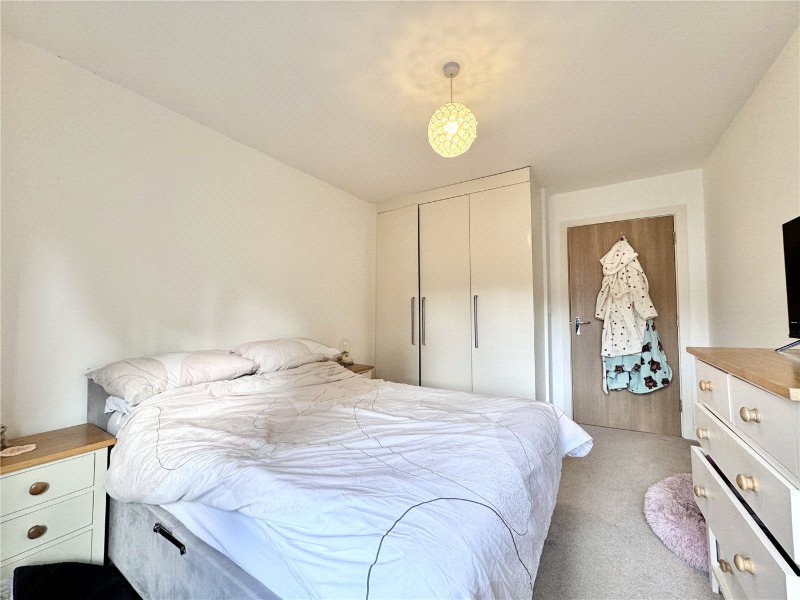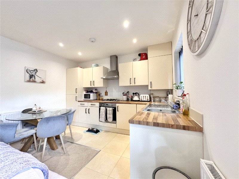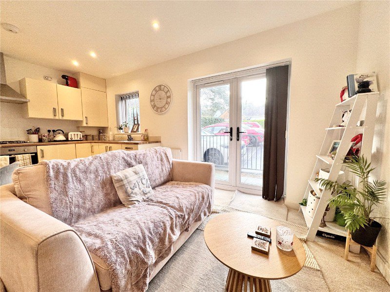 The lounge is a bright room with ample space for a dining table and access on the ground floor patio through double French doors. The kitchen is open to the lounge and is fitted with a range of base and eye level work units with integrated appliances to include a washing machine, dish washer and tall standing fridge / freezer.