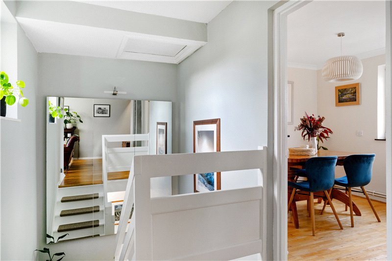 To the left of the staircase is the kitchen, which features an abundance of storage and worktop space, an induction hob, and an integrated oven. There is also space for a washing machine and dishwasher, as well as room to accommodate a dining table and chairs.