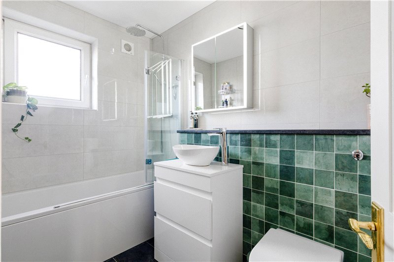 Also located on this floor is the bathroom, fitted with a shower over bath, wash basin with storage beneath, WC, and a heated towel rail.