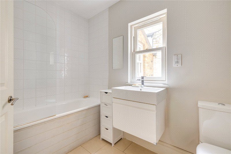 The property is accessed via its own private entrance, leading into a central hallway that connects all principal rooms. At the front of the property sits a generous double bedroom room with excellent ceiling height, and a square bay window to allow for plenty of natural light. A second double bedroom offers built-in storage, a direct access to a lightwell and a en-suite shower room. A modern family bathroom also sits in the middle of the property.