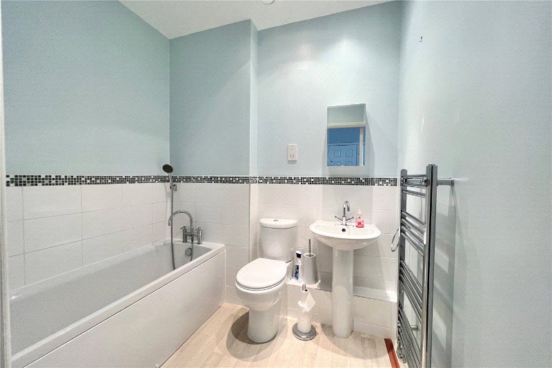The principal bedroom is another well-proportioned room with French doors opening out onto a second south facing balcony and fitted wardrobes. Bedroom two also has fitted wardrobes and very handy built-in shelving.
