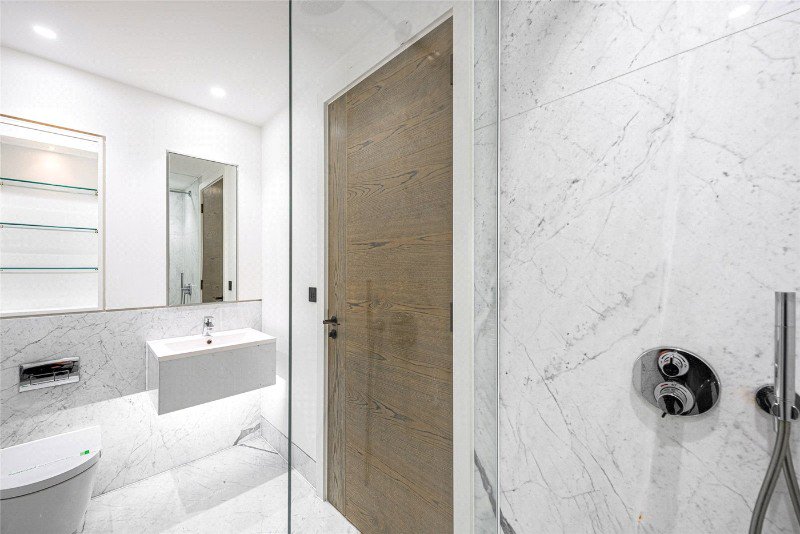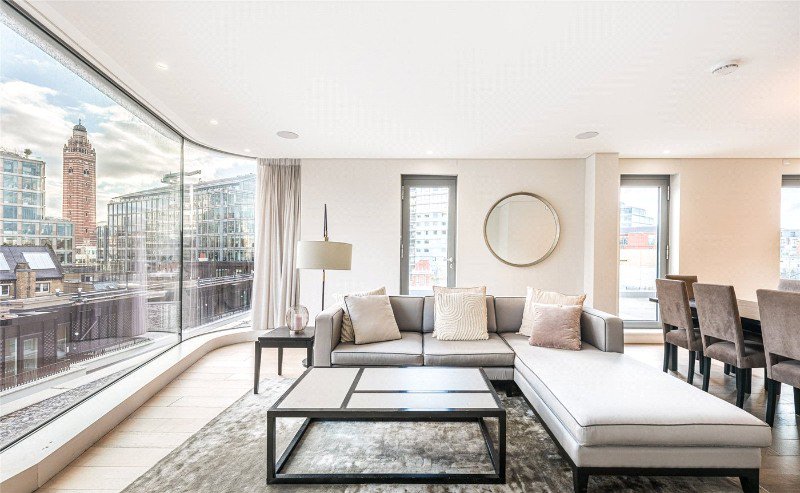 The flat is filled with light, due in part to the incredible curved glass windows, and covers some c.1596 square feet. Offering 3 grand bedrooms, all with built-in storage and ensuite shower rooms. There is a further guest WC and an incredible, bright reception room with stylish, modern kitchen and dining area thoughtfully incorporated.