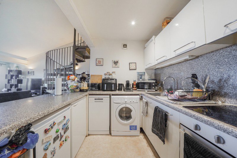 A striking spiral staircase leads to the mezzanine bedroom, creating a stylish focal point and enhancing the sense of space. The mezzanine level benefits from a walk-through dressing room, providing excellent storage and a seamless transition into the sleeping area. The well appointed kitchen offers modern appliances and ample storage, while excellent natural light flows throughout the apartment, creating a bright and welcoming atmosphere.