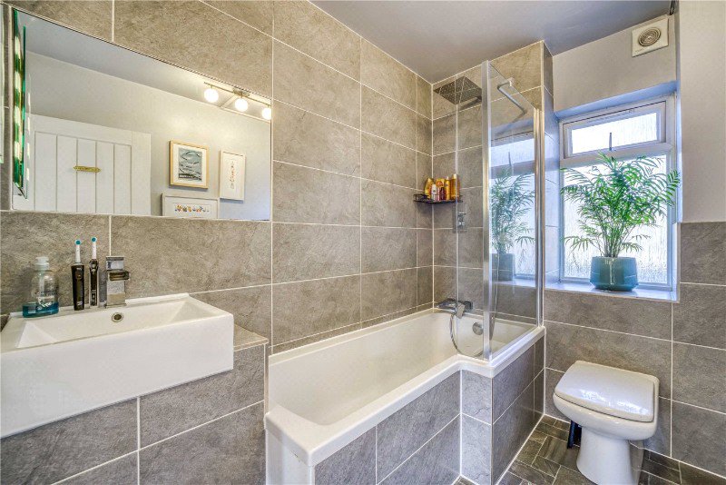 - Contemporary fully tiled bathroom with shower over bath