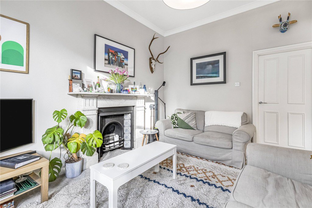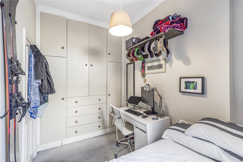 Adjacent to the reception room is the first double bedroom, featuring built-in storage, high ceilings and sash windows. To the rear of the property, down a short flight of stairs, is the principal double bedroom, positioned next to a well-presented modern bathroom.