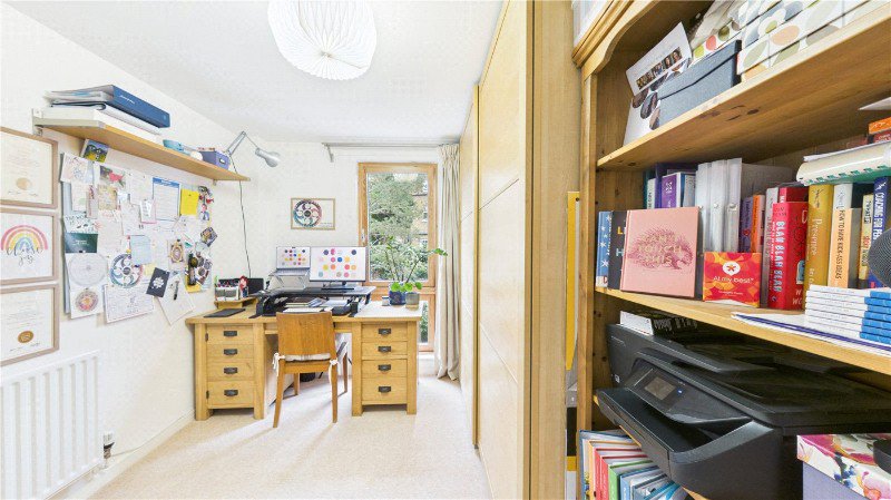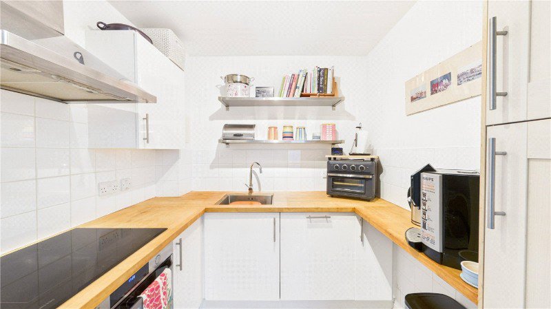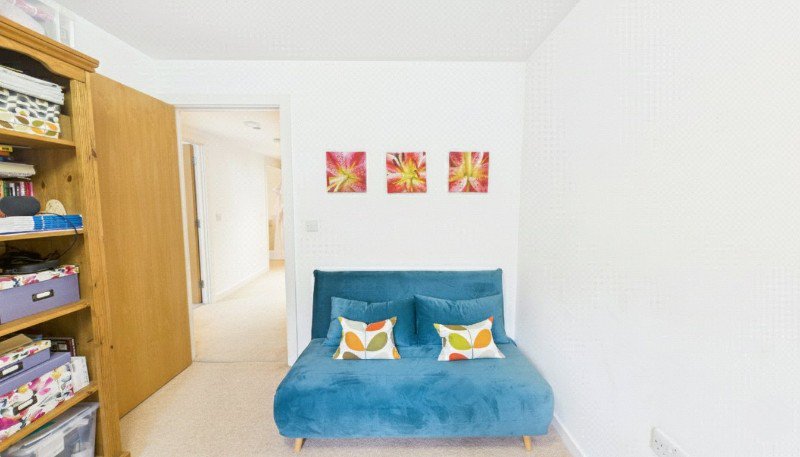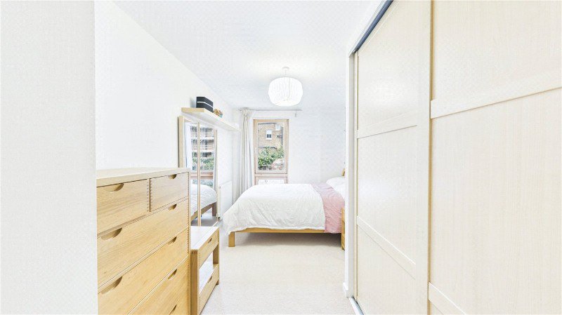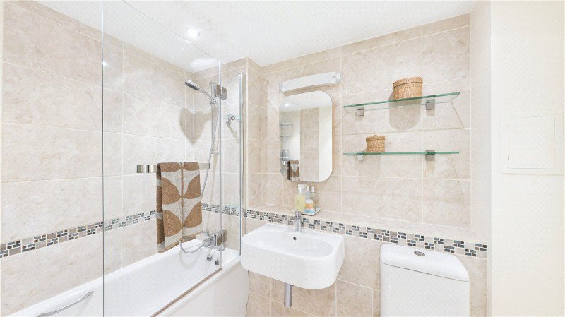 Both bedrooms are good doubles in size. The principal bedroom benefits from fitted storage; the second bedroom is also well proportioned and would work equally well as a guest room or home office. The bathroom is tiled and contemporary, with a bath and shower-over-bath arrangement, basin and WC. A useful entrance hall provides additional storage and a clear circulation space that keeps the living areas calm and uncluttered.