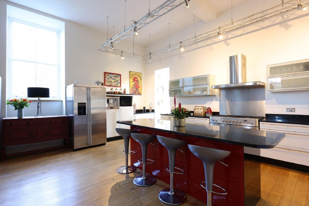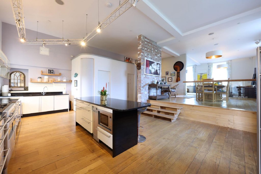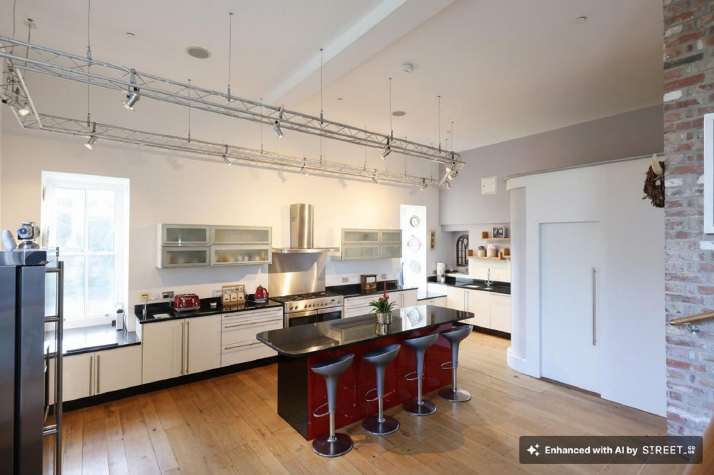 A charming brick-decorated archway beckons you into a vast modern kitchen, which boasts a second stylish pod that houses the laundry room and additional storage.