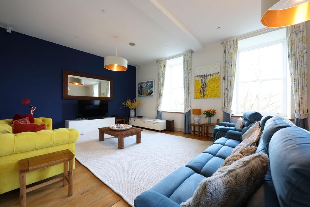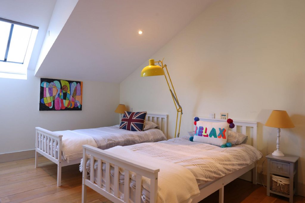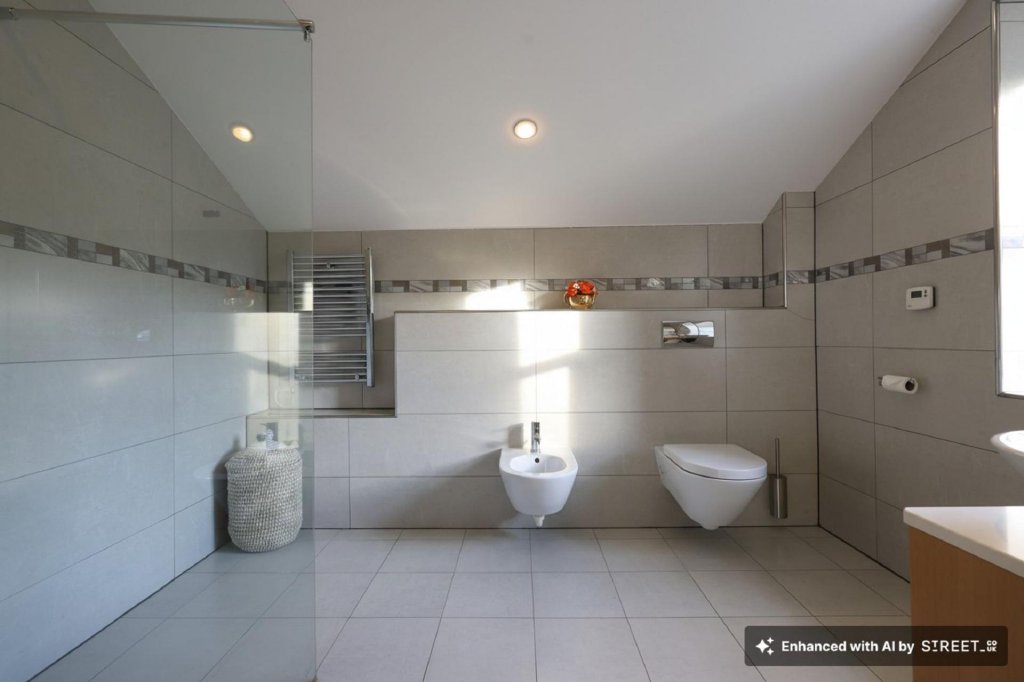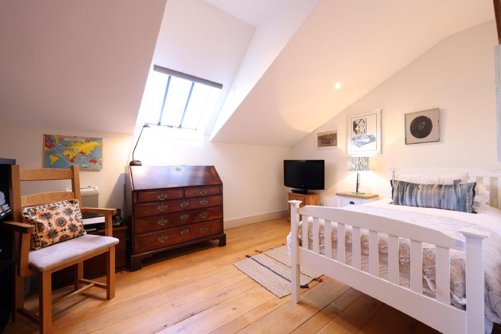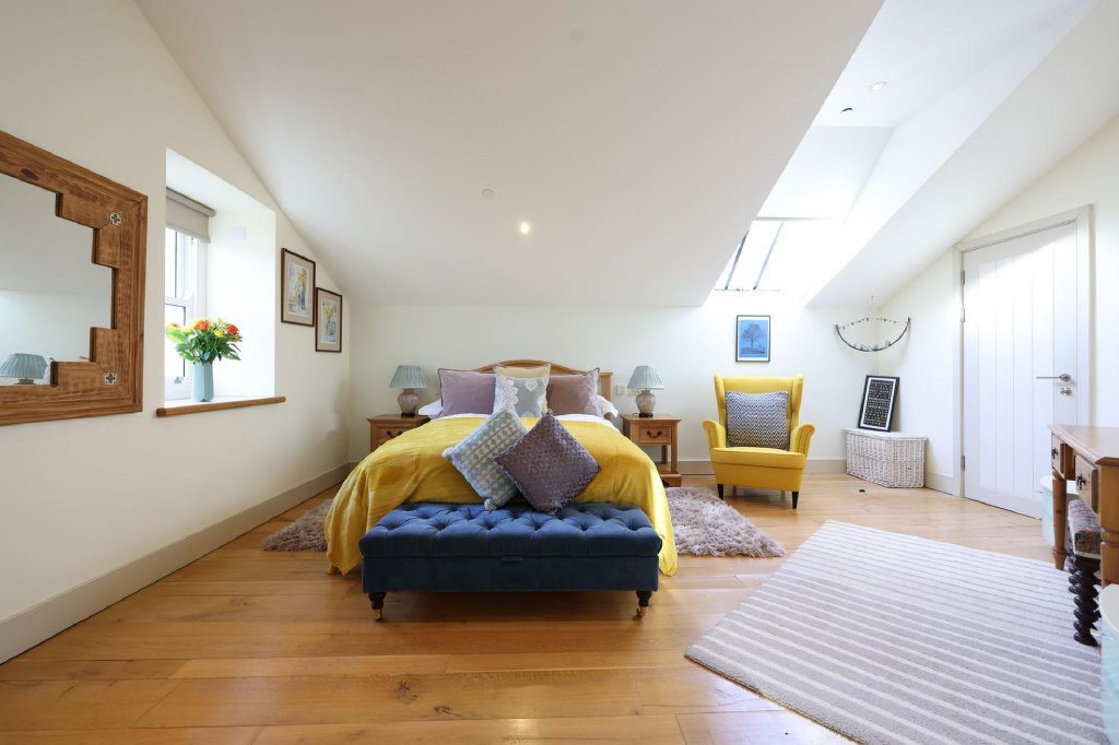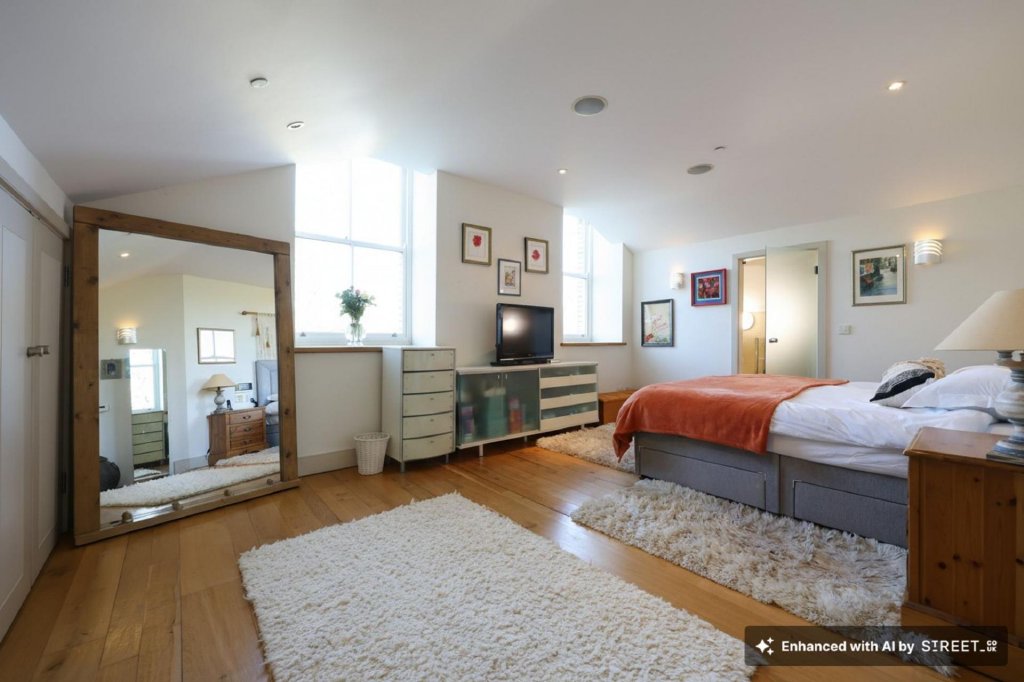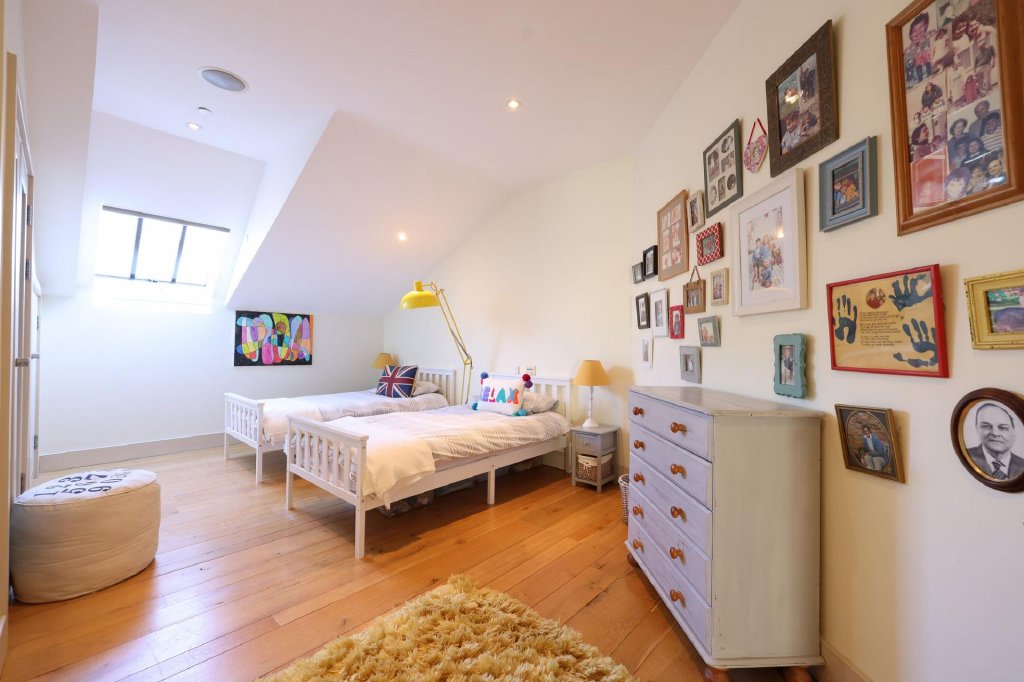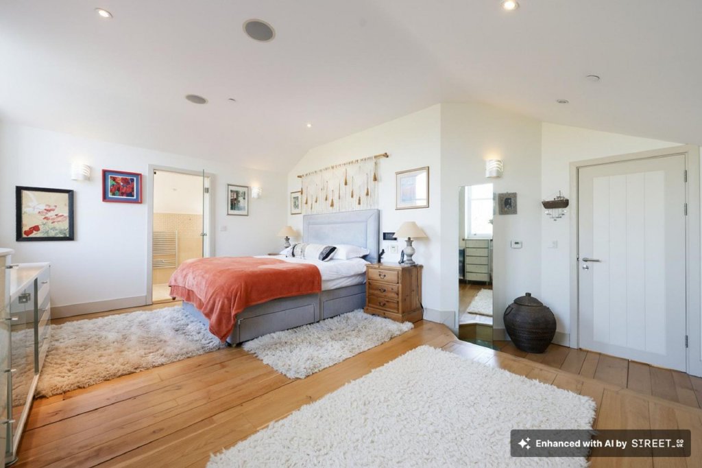 To the right and left, are two luxurious super king-sized double bedrooms. The right side this room boasts a generously sized south-facing window at the front and a west-facing skylight, filling the room with light. This suite includes a private completely fitted en-suite shower room.
