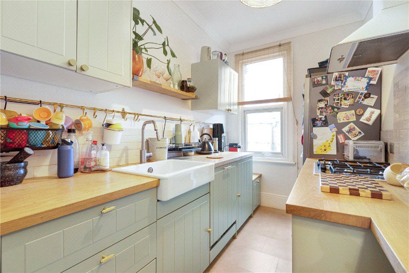 To the rear is a beautifully presented and fully fitted galley kitchen, thoughtfully arranged with ample cabinetry, wooden worktops and integrated appliances, providing a practical and stylish space for everyday cooking. The kitchen also benefits from good natural light and pleasant outlooks.