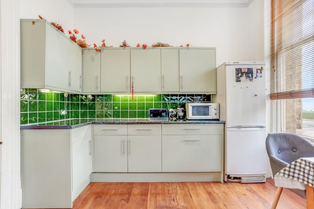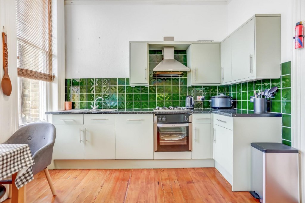 South facing windows brighten the kitchen just off the living room. This space benefits from plenty of sage green modern cabinetry set against black worktops for a timeless feel. The kitchen is fitted with a gas hob, oven and built-in dishwasher, with ample room for a breakfast table and chairs.