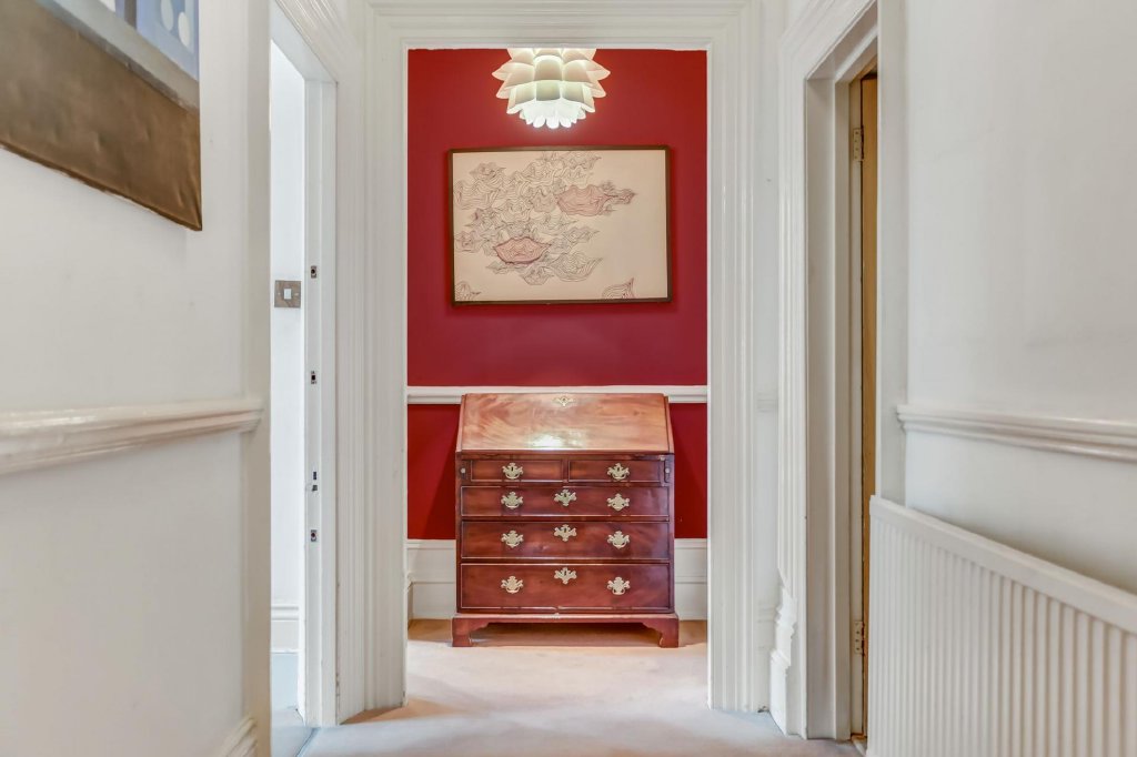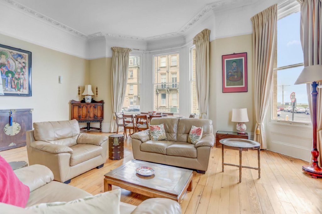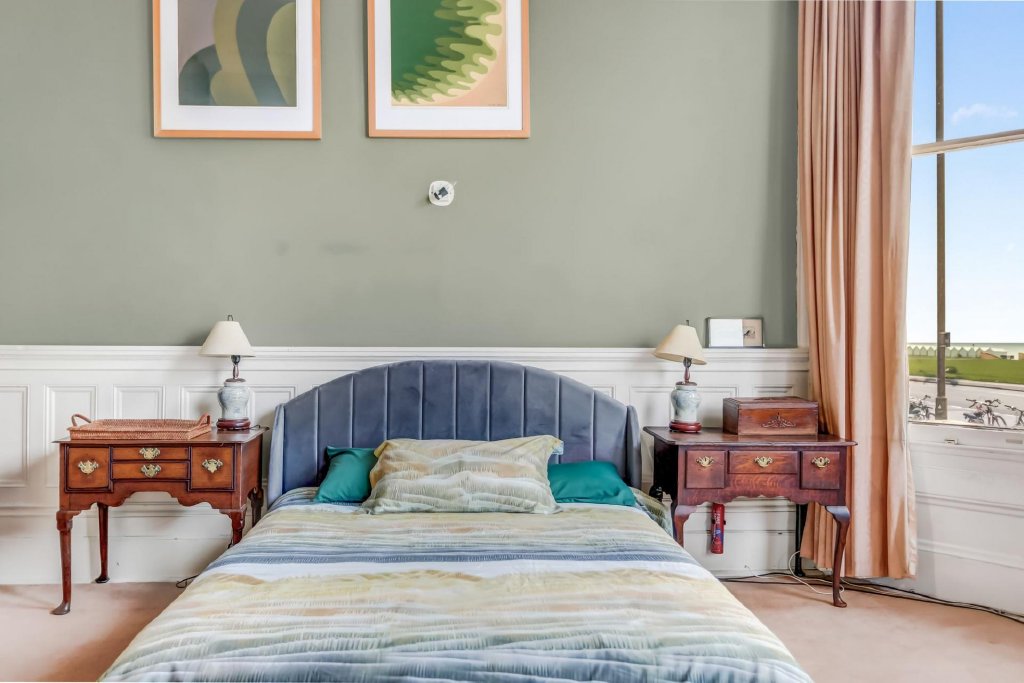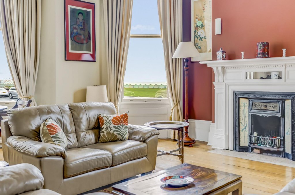 With a detailed wood and tiled surround fireplace, delicate cornicing and tall sash bay windows, the reception room and dining area feature well-placed period details while still feeling modern thanks to earth-toned décor. This glorious space is bathed in eastern and southern light with views towards the sea, creating a strong connection to the outside.