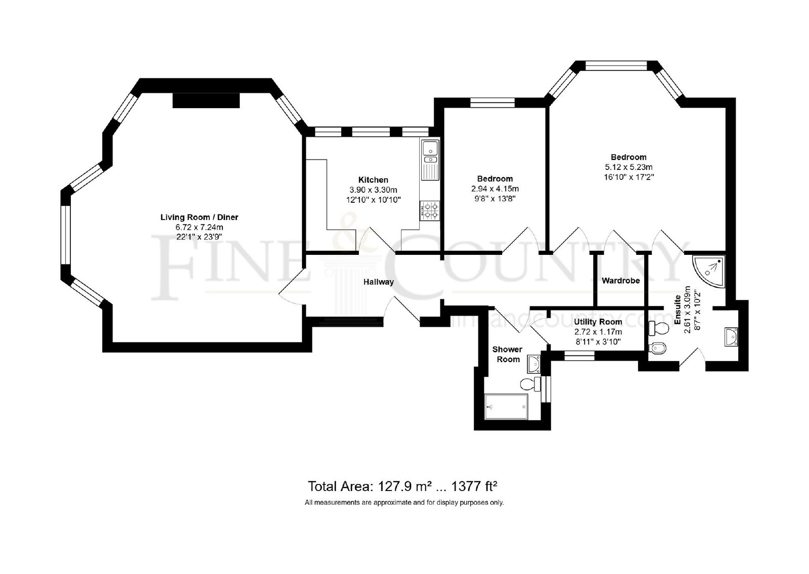 The sizeable primary bedroom has sash windows including a bay window, a large built-in wardrobe for storage and a luxurious en suite. The second bedroom is a double and could also be used as an office or guest room. Opposite the second bedroom, the guest bathroom has a shower, neutral tiling and a crisp modern suite. A useful separate utility room keeps the kitchen free from the evidence of household chores, its position near the bedrooms makes it easy for laundry to be neatly put away.